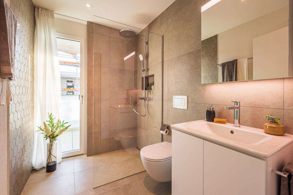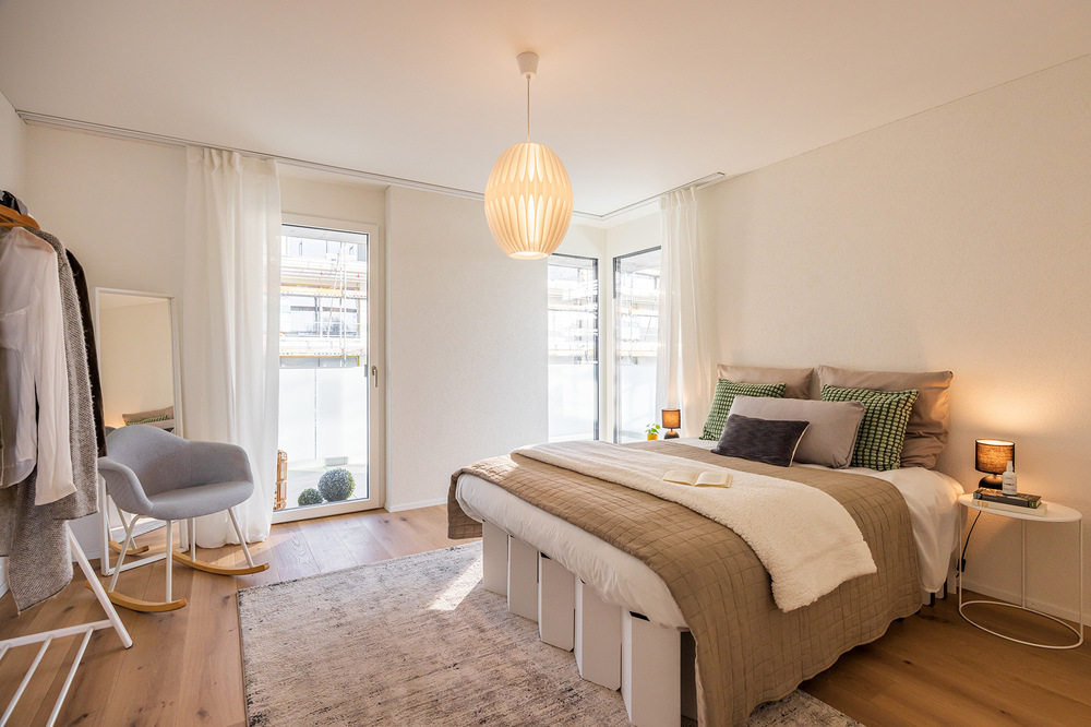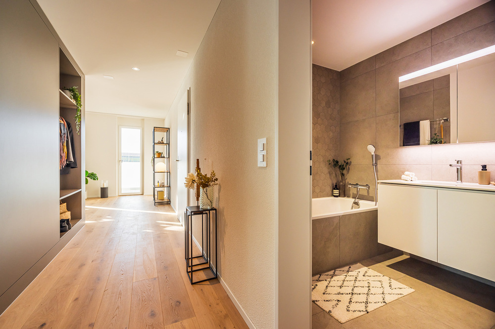 Dreifachverglaste Fenster und elektrische Lamellenstoren garantieren hervorragende Wärme- und Schalldämmung. Eine Fussbodenheizung sorgt für angenehme Temperaturen im ganzen Wohnbereich. Grosszügige Balkone mit Glasgeländern und elektrisch betriebenen Sonnenstoren laden zur Entspannung ein. Alle Aussenbereiche sind mit frostsicheren Wasseranschlüssen ausgestattet. Ein Lift führt bequem in alle Etagen sowie in die Einstellhalle. Einzelne Wohnungen verfügen zudem über einen direkten, exklusiven Liftzugang. Dies sorgt für maximalen Komfort und Privatsphäre.